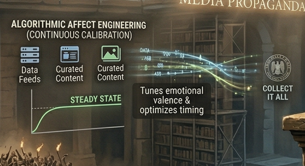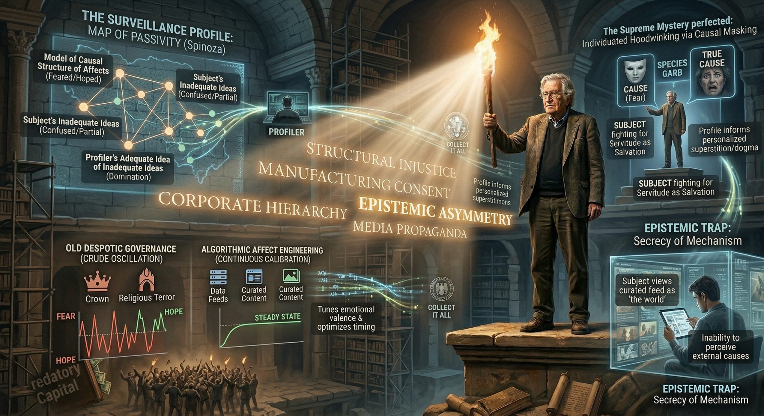 The NSA’s mass collection exists to produce profiles. A profile is an adequate idea, held by the profiling power, of the specific pattern of inadequate ideas through which a subject can be affectively moved. Algorithmic platforms — social media — provide the mechanism by which this knowledge is applied: not through the crude oscillation of hope and fear (the old governance by superstition), but through the continuous, individuated calibration of what the subject sees, feels, and consequently believes. This constitutes a new form of governance — one that does not replace fear with something other than affect-manipulation, but rather perfects affect-manipulation by eliminating the volatility that was the old regime’s weakness. The subject is governed more completely precisely because the governance operates through the very confused ideas that constitute the subject’s passivity, reinforcing rather than disrupting them. The supreme mystery of despotic statecraft — making men fight for their servitude as if it were their salvation — is thereby achieved not through a shared public theater of religious superstition, but through an individuated, invisible, continuously calibrated environment of informational determination.