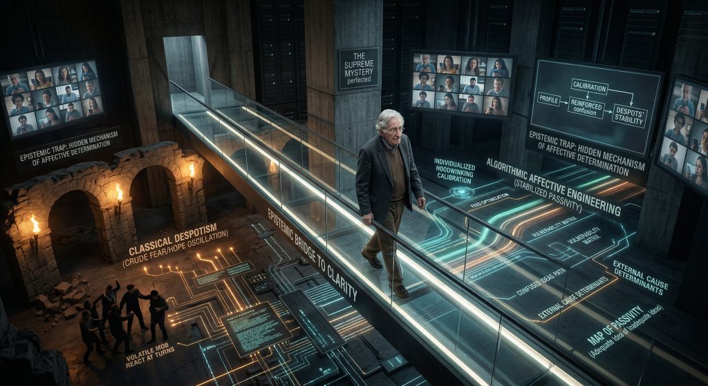 In Spinoza’s terms: the true aim of government is liberty — “to free every man from fear, that he may live in all possible security” (TTP Ch. XX). What is here described is the precise inversion of that aim: a system designed not to free the subject from confused and inadequate ideas, but to deepen and stabilize the confusion — to ensure that the subject remains maximally passive, maximally governable, and maximally ignorant of the fact that they are being governed at all.