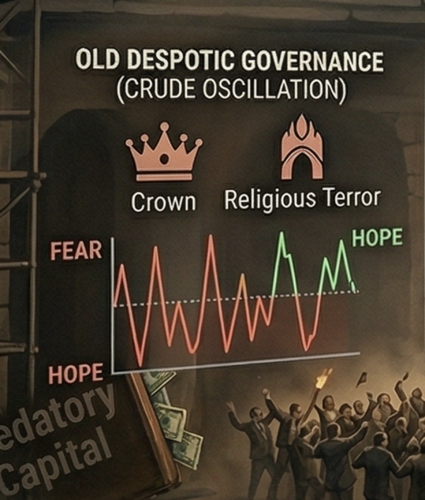 This is the crucial difference: the old regime destabilized affects in order to govern them; the new apparatus stabilizesaffects in order to govern them. Both exploit passivity. But the latter is, in Spinoza’s terms, more adequate to its purpose— it achieves governance with less resistance precisely because it does not produce the volatility that is the classical regime’s greatest vulnerability.