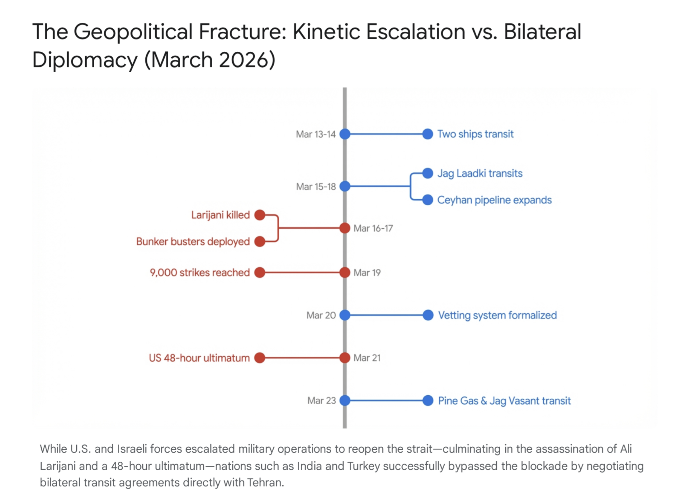 - March 13–14, 2026: Preceding the peak of the crisis, Indian-flagged LPG carriers MT Shivalik and MT Nanda Devi successfully cross the Strait of Hormuz, loaded with approximately 92,700 metric tonnes of Qatari gas.21 Their safe transit is secured via urgent bilateral diplomacy and execution under the Indian Navy’s Operation Sankalp, establishing an early precedent for non-Western bilateral transit.21