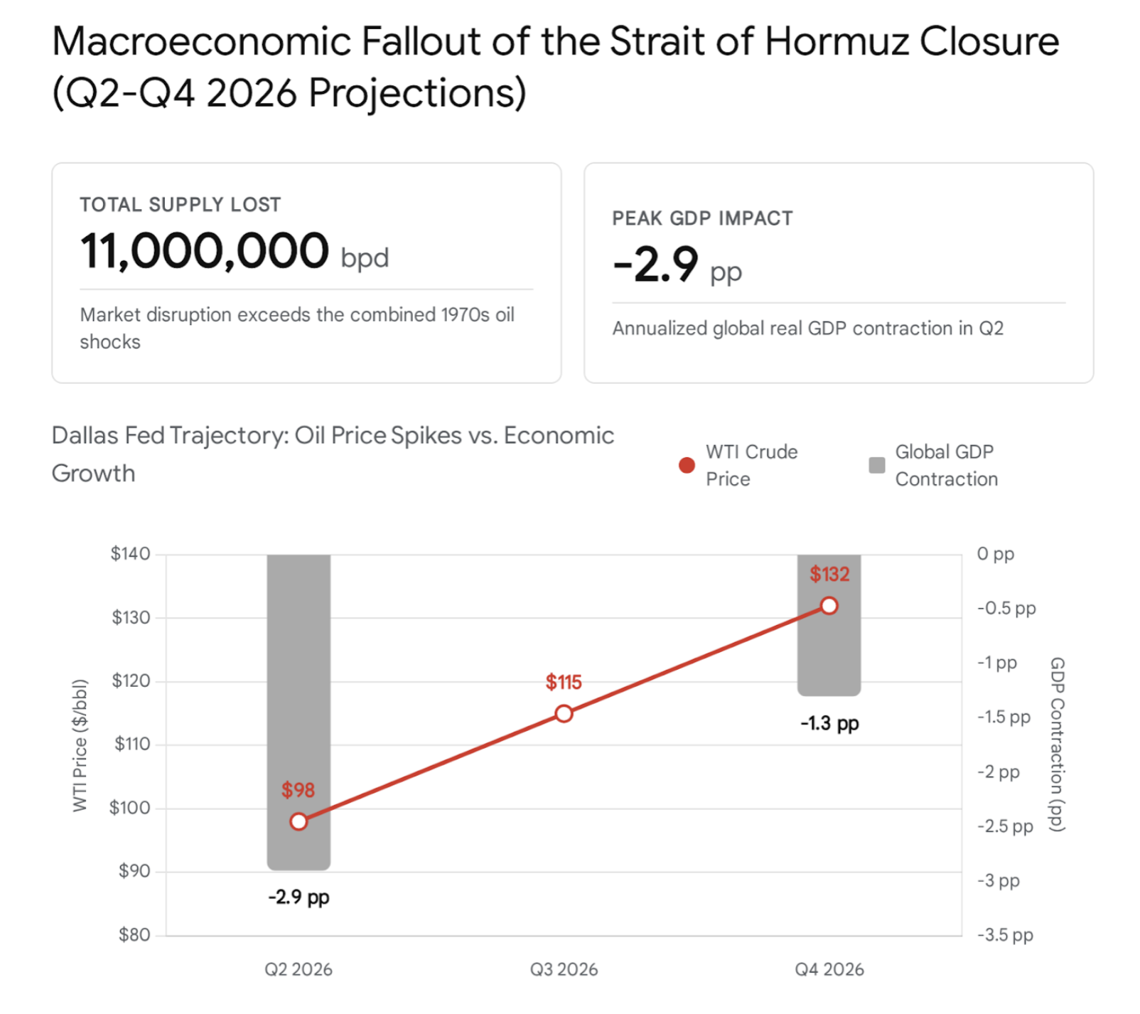 The scale of the energy disruption is difficult to overstate. The Federal Reserve Bank of Dallas has published extensive quantitative modeling assessing the impact of the Hormuz blockade on the global economy.28 The Dallas Fed projects that a sustained closure spanning the second quarter of 2026 will push the average price of West Texas Intermediate (WTI) crude oil to $98 per barrel.28 If the blockade extends for two quarters, WTI is forecasted to reach $115 per barrel in Q3; if it persists for three quarters, prices could violently breach $132 per barrel by year-end.28