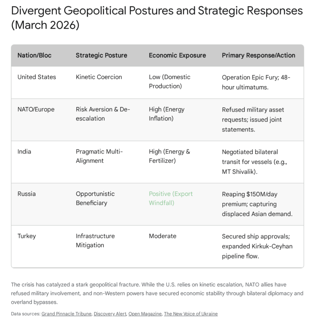Crucially, the events of mid-to-late March 2026 reveal a stark and widening divergence between Washington’s aggressive military posture and the pragmatic, self-preservationist diplomatic maneuvers of both European allies and the Global South. While the United States has conducted a massive, unprecedented aerial campaign to physically clear the strait, traditional NATO allies have categorically refused U.S. requests to contribute military assets to a naval escort coalition.5 Conversely, nations such as India, China, and Turkey have successfully secured bilateral safe passage for their respective commercial fleets directly through negotiations with Tehran.6 This emerging reality structurally positions Iran not as a degraded power, but as the selective “gatekeeper” of the world’s most critical energy chokepoint, demonstrating that overwhelming kinetic naval superiority is increasingly constrained by asymmetric area-denial strategies and global maritime capital regulations.